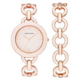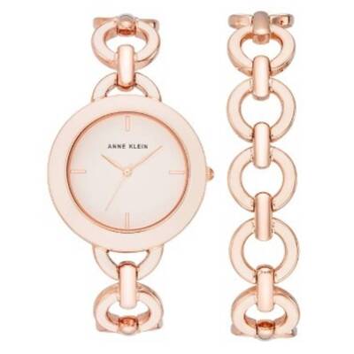 Rose gold-tone metal case with rose gold-tone metal and ceramic bracelet, fixed ceramic bezel, rose gold-tone dial with rose gold-tone hands and index hour markers, analog quartz movement, scratch resistant mineral crystal, pull/push crown, solid case back, round case shape, 38 mm case size, jewelry clasp, water resistant to 30 meters / 100 feet, functions include hour, minute, second, includes matching bracelet, dress watch style.