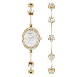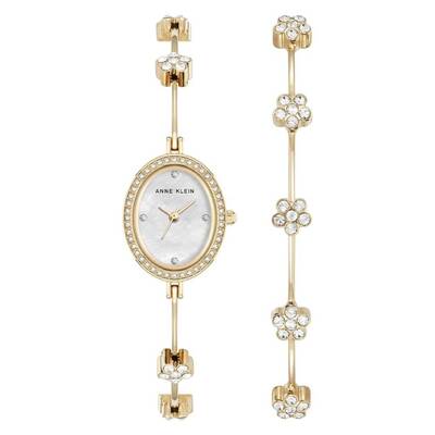 Gold-tone metal case and bracelet. Fixed gold-tone metal bezel. White dial with gold-tone hands. Analog dial type. Quartz movement. Scratch resistant mineral crystal. Pull/push crown. Solid case back. Oval case shape, 19 mm diameter, 6.5 mm thickness. 5 mm band width. Jewelry clasp. Functions include hour, minute, and second. Matching bangle bracelet included. Not water resistant. Dress watch style.