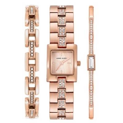 Rose gold-tone metal case and bracelet. Fixed rose gold-tone metal bezel. Rose gold-tone dial with rose gold-tone hands and index hour markers. Analog quartz movement. Scratch resistant mineral crystal. Pull/push crown. Solid case back. Square case shape. Jewelry clasp. Water resistant to 30 meters / 100 feet. Hour, minute, second functions. Includes two matching crystal-accented bracelets. Casual watch style.