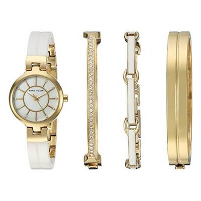Gold-tone case with a white ceramic bracelet. Fixed gold-tone bezel. Mother of pearl dial with gold-tone hands and Swarovski crystal hour markers. Dial Type: Analog. Quartz movement. Scratch resistant mineral crystal. Pull / push crown. Solid case back. Round case shape, case size: 26 mm. Jewelry clasp. Functions: hour, minute, second. Additional Info: set includes: 1 bangle accented with 31 clear Swarovski crystals, 1 bangle with indented center line and 1 curved link bracelet with white enamel fill. Dress watch style. Anne Klein Quartz Ladies Gold-Tone and White Ceramic Watch and Bracelet Set AK-2048GXST.