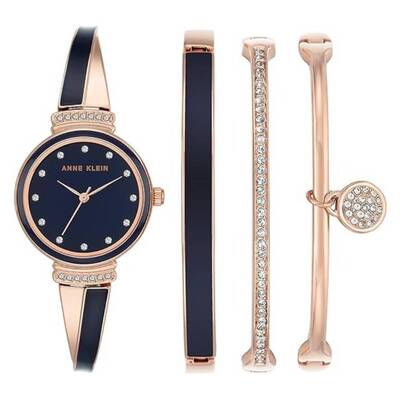 Rose gold-tone metal case with a rose gold-tone and navy blue metal bracelet. Fixed navy blue metal bezel. Navy blue dial with crystal hour markers. Dial Type: Analog. Quartz movement. Scratch resistant mineral crystal. Pull / push crown. Solid case back. Round case shape, case size: 26 mm. Jewelry clasp. Water resistant at 30 meters / 100 feet. Functions: hour, minute, second. Additional Info: set includes: one bangle with navy blue enamel filling; one bangle set with premium crystals and one bangle with premium crystal accented charm. Dress watch style. Watch label: Japan Movt. Anne Klein Quartz Crystal Navy Blue Dial Ladies Watch and Bracelet Set AK-2716NVST.