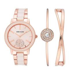 Rose gold-tone metal case with a two-tone (rose gold-tone and white) metal and alloy bracelet. Fixed white alloy bezel. Rose gold-tone dial with rose gold-tone hands and index hour markers. Dial Type: Analog. One subdial displaying: small second. Quartz movement. Scratch resistant mineral crystal. Pull / push crown. Solid case back. Round case shape. Deployment with push button release clasp. Water resistant at 30 meters / 100 feet. Functions: hour, minute, small second. Additional Info: set includes: two matching bracelets. Casual watch style. Anne Klein Quartz Rose Gold Dial Ladies Watch and Bracelet Set AK/3538LPST.