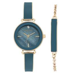 Gold-tone metal case with a two-tone (gold-tone and blue) metal and alloy bracelet. Fixed blue alloy bezel. Blue dial with gold-tone hands and index hour markers. Dial Type: Analog. Quartz movement. Scratch resistant mineral crystal. Pull / push crown. Solid case back. Round case shape, case size: 30 mm. Jewelry clasp. Water resistant at 30 meters / 100 feet. Functions: hour, minute, second. Additional Info: set includes: one matching bracelet. Casual watch style. Anne Klein Quartz Blue Dial Ladies Watch and Bracelet Set AK/3620BLST.