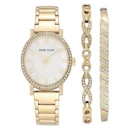 Gold-tone metal case and bracelet. Fixed gold-tone bezel with crystal set. White dial with gold-tone hands and Roman numeral hour markers. Dial Type: Analog. Quartz movement. Scratch resistant mineral crystal. Pull / push crown. Solid case back. Round case shape. Water resistant at 30 meters / 100 feet. Functions: hour, minute, second. Additional Info: set includes: two matching bracelets accented with crystals. Dress watch style. Anne Klein Quartz Crystal White Dial Ladies Watch and Bracelet Set AK/3638GPST.