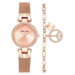 Rose gold-tone metal case and bracelet. Fixed rose gold-tone bezel with crystal set. Rose gold-tone dial with rose gold-tone hands and index hour markers. Dial Type: Analog. Quartz movement. Scratch resistant mineral crystal. Pull / push crown. Solid case back. Round case shape. Jewelry clasp. Water resistant at 30 meters / 100 feet. Functions: hour, minute, second. Additional Info: set includes one matching bracelet. Casual watch style. Watch label: Japan Movt. Anne Klein Quartz Crystal Rose Gold Dial Ladies Watch and Bracelet Set AK-3616RGST.