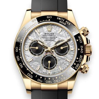 Yellow gold-tone 18kt yellow gold case with a black rubber strap. Fixed tachymeter scale black cerachrom bezel. Meteorite dial with yellow gold-tone hands and index hour markers. Minute markers around the outer rim. Dial Type: Analog. Luminescent hands and markers. Chronograph - three sub-dials displaying: 60 second, 30 minute and 12 hour. Rolex Calibre 4131 Automatic movement, based upon Rolex Calibre 4130, containing 47 Jewels, bitting at 28800 vph, and has a power reserve of approximately 72 hours. Scratch resistant sapphire crystal. Screw down crown. Solid case back. Round case shape, case size: 40 mm. Fold over clasp with a safety release. Water resistant at 100 meters / 330 feet. Functions: chronograph, hour, minute, small second, chronometer. Cosmograph Daytona Series. Luxury watch style. Watch label: Swiss Made. Rolex Cosmograph Daytona Chronograph Automatic Chronometer Mens Watch m126518ln-0016.