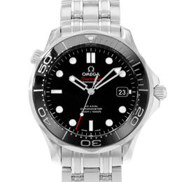 Pre-owned Stainless steel case with a stainless steel bracelet. Uni-directional rotating stainless steel bezel with an inlaid black ceramic ring. Black dial with silver-tone skeleton hands and dot hour markers. Minute markers around the outer rim. Dial Type: Analog. Luminescent hands and markers. Date display at the 3 o'clock position. Omega calibre 2500 automatic movement, based upon ETA 2892-A2, containing 27 Jewels, bitting at 25200 vph, and has a power reserve of approximately 48 hours. Scratch resistant sapphire crystal. Screw down crown. Solid case back. Round case shape. Case size: 41 mm. Case thickness: 12 mm. Band width: 20 mm. Band length: 8 inches. Deployment clasp with a double push button release. Water resistant at 300 meters / 1000 feet. Functions: date, hour, minute, second, chronometer. Seamaster Professional Series. Dive watch style. Watch label: Swiss Made. Item Variations: 212 30 41 20 01 003, 212-30-41-20-01-003, 212/30/41/20/01/003, 21230412001003. Omega Seamaster Professional Automatic Black Dial Mens Watch 212.30.41.20.01.003.