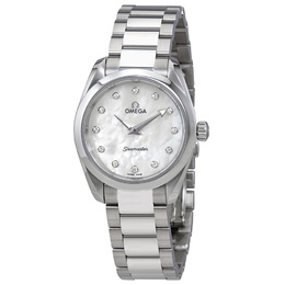 Pre-owned Silver-tone stainless steel case with a silver-tone stainless steel bracelet. Fixed silver-tone stainless steel bezel. White mother of pearl dial with luminous silver-tone hands and diamond hour markers. Dial Type: Analog. Luminescent hands. Omega Calibre 4061 quartz movement. Scratch resistant sapphire crystal. Screw down crown. Solid case back. Round case shape. Case size: 28 mm. Band width: 14 mm. Fold over with push button release clasp. Water resistant at 150 metres / 500 feet. Functions: hour, minute. Luxury watch style. Watch label: Swiss Made. Omega Seamaster Aqua Terra Ladies Watch 220.10.28.60.55.001.
