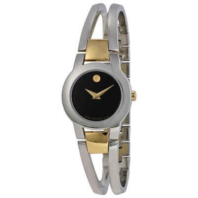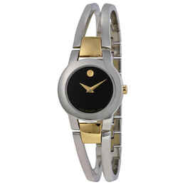 Stainless steel case with a two-tone stainless steel bracelet. Fixed stainless steel bezel. Black dial with gold- tone hands. No markers. The signature Movado Dot appears at the 12 o'clock position. Quartz movement. Scratch resistant sapphire crystal. Solid case back. Case diameter: 24 mm. Case thickness: 6.5 mm. Jewelry clasp. Water resistant at 30 meters / 100 feet. Functions: hours, minutes. Movado Amorosa Ladies Watch 0604760.