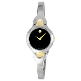 Silver-tone stainless steel case with a two-tone stainless steel bracelet. Fixed silver-tone stainless steel bezel. Black dial with gold-tone dauphine hour and minute hands hands. No markers. the signature Movado dot appears at the 12 o'clock position. Dial Type: Analog. Quartz movement. Scratch resistant sapphire crystal. Pull / push crown. Solid case back. Round case shape, case size: 24 mm, case thickness: 6 mm. Band width: 6 mm. Jewelry clasp. Water resistant at 30 meters / 100 feet. Functions: hours, minutes. Dress watch style. Watch label: Swiss Made. Item Variations: 605248, 0605248, Movado-605248, Movado-0605248. Movado Kara Quartz Black Dial Ladies Watch 0605248.