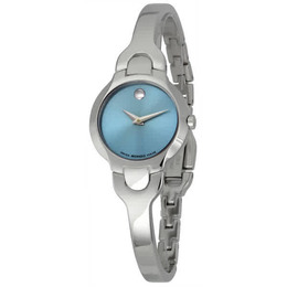 Silver-tone stainless steel case with a silver-tone stainless steel bracelet. Fixed silver-tone stainless steel bezel. Blue dial with silver-tone hands. No markers. the signature Movado dot appears at the 12 o'clock position. Dial Type: Analog. Quartz movement. Scratch resistant sapphire crystal. Pull / push crown. Solid case back. Round case shape, case size: 24 mm, case thickness: 6 mm. Jewelry clasp. Water resistant at 30 meters / 100 feet. Functions: hour, minute. Dress watch style. Watch label: Swiss Made. Item Variations: 605283, 0605283, Movado-605283, Movado-0605283. Movado Kara Quartz Blue Dial Ladies Watch 0605283.