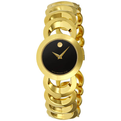 Gold-tone stainless steel case with a gold-tone stainless steel bracelet. Fixed gold-tone stainless steel bezel. Black dial with gold-tone dauphine hour and minute hands hands. No markers. the signature Movado dot appears at the 12 o'clock position. Dial Type: Analog. Quartz movement. Scratch resistant sapphire crystal. Pull / push crown. Solid case back. Round case shape, case size: 25 mm, case thickness: 5.7 mm. Hidden push button deployment clasp. Water resistant at 30 meters / 100 feet. Functions: hour, minute. Fashion watch style. Watch label: Swiss Made. Item Variations: 605528, 0605528, Movado-605528, Movado-0605528. Movado Rondiro Quartz Black Dial Ladies Watch 0605528.