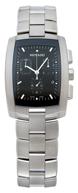 Stainless steel case and bracelet. Black dial. Chrongraph quartz movement. Hidden folding clasp. Scratch resistant sapphire crystal. Case size 30mm x 44mm. Case thickness 10.5mm. Water resistant at 30 meters (100 feet). Movado Eliro Chronograph Mens watch 0605571 / 605571