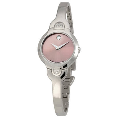 Stainless steel case with a stainless steel bracelet. Fixed stainless steel set with 6 diamonds bezel. Pink dial with silver-tone hands. No markers. The signature Movado Dot appears at the 12 o'clock position. Dial Type: Analog. Quartz movement. Scratch resistant sapphire crystal. Solid case back. Case diameter: 24 mm. Case thickness: 5.5 mm. Jewelry clasp. Water resistant at 30 meters / 100 feet. Functions: hours, minutes. Dress watch style. Watch label: Swiss Made. Movado Kara Diamond Pink Ladies Watch 0605606.