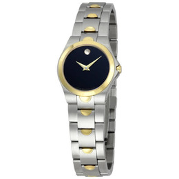 Stainless steel case with a two-tone (silver-tone and gold-tone) stainless steel bracelet. Fixed gold-tone bezel. Black dial with gold-tone dauphine hands. No markers. Movado dot appears at the 12 o'clock position. Dial Type: Analog. Quartz movement. Scratch resistant sapphire crystal. Pull / push crown. Solid case back. Round case shape. Case size: 28 mm. Case thickness: 6 mm. Deployment clasp with a push button release. Water resistant at 30 meters / 100 feet. Functions: hour, minute. Luno Series. Dress watch style. Watch label: Swiss Made. Item Variations: 605636, 0605636, Movado-605636, Movado-0605636. Movado Luno Quartz Black Dial Ladies Watch 0605636.
