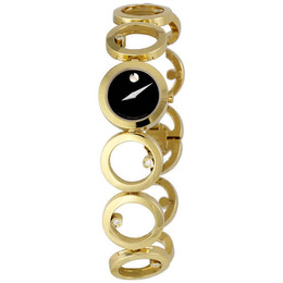 Gold-tone stainless steel case with a gold-tone stainless steel with diamonds bracelet. Fixed gold-tone stainless steel bezel. Black dial with gold-tone hands and the signature Movado dot appears at the 12 o'clock position hour markers. Dial Type: Analog. Quartz movement. Scratch resistant sapphire crystal. Pull / push crown. Solid case back. Round case shape, case size: 24 mm, case thickness: 5.6 mm. Jewelry clasp. Water resistant at 30 meters / 100 feet. Functions: hour, minute. Fashion watch style. Watch label: Swiss Made. Movado Ono Quartz Black Dial Ladies Watch 0605821.