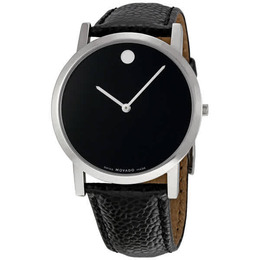 Silver-tone stainless steel case with a black leather strap. Fixed silver-tone stainless steel bezel. Black dial with silver-tone hands. No markers. the Movado dot appears at the 12 o'clock position. Dial Type: Analog. Quartz movement. Scratch resistant sapphire crystal. Pull / push crown. Solid case back. Round case shape. Case size: 38 mm. Tang clasp. Water resistant at 30 meters / 100 feet. Functions: hour, minute. Dress watch style. Watch label: Swiss Made. Movado Museum Quartz Black Dial Men's Watch 0606009.