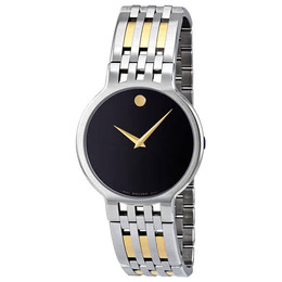 Stainless steel case with a stainless steel bracelet with gold-tone inserts. Fixed satinless steel bezel. Black museum dial with gold-tone hands. No markers. The signature Movado 'Dot' appears at the 12 o'clock position. Battery operated Swiss quartz movement. Scratch resistant sapphire crystal. Push in crown. Screw down case back. Case diameter: 38 mm. Case thickness: 6.5 mm. Butterfly deployment clasp. Water resistant at 30 meters / 100 feet. Movado Mens Esperanza Two-tone Watch 0606044.
