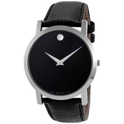 Silver-tone stainless steel case with a black leather strap. Fixed silver-tone stainless steel bezel. Black dial with silver-tone hands. No markers. signature movado dot appears at the 12 o'clock position. Dial Type: Analog. Quartz movement. Scratch resistant sapphire crystal. Pull / push crown. Solid case back. Round case shape. Case size: 40 mm. Tang clasp. Water resistant at 30 meters / 100 feet. Functions: hour, minute. Fashion watch style. Watch label: Swiss Made. Movado Museum Quartz Black Dial Mens Watch 0606085.