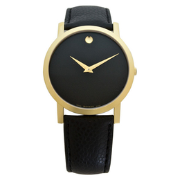 Stainless steel case with a black leather strap. Fixed bezel. Black museum dial with gold-tone dauphine hour and minute hands. No markers. the signature Movado dot appears at the 12 o'clock position. Battery operated quartz movement. Scratch resistant sapphire crystal. Case diameter: 40mm. Case thickness: 7.2mm. Buckle clasp. Water resistant at 30 meters / 100 feet. Functions: hours, minutes. Movado Museum Gold-Tone Men's Watch 0606086.