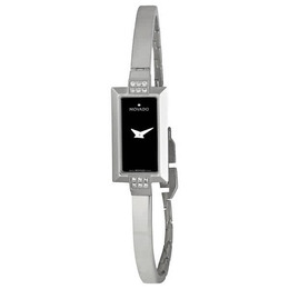 Stainless steel case with a stainless steel bangle. Fixed stainless steel set with diamonds bezel. Black dial with silver-tone hands. No markers. Battery operated quartz movement. Scratch resistant sapphire crystal. Solid case back. Case diameter: 14 mm. Case thickness: 5 mm. Jewelry clasp. Water resistant at 30 meters / 100 feet. Functions: hour, minute. Movado Ladies Bela Stainless Steel Bangle Bracelet Watch 0606133.