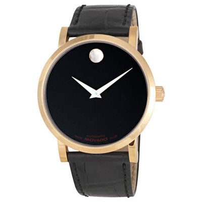 18k rose gold case with a black leather strap. Fixed 18k rose gold bezel. Black dial with gold tone hands and the signature Movado dot appears at the 12 o'clock position hour markers. Dial Type: Analog. Automatic movement. Scratch resistant sapphire crystal. Gold-tone crown. Transparent case back. Round case shape. Case size: 42 mm. Buckle clasp. Water resistant at 30 meters / 100 feet. Functions: hour, minute. Fashion watch style. Watch label: Swiss Made. Movado Red Label Automatic Black Dial Men's Watch 0606134.