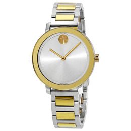 Stainless steel case with a two-tone (silver-tone and yellow gold PVD) stainless steel bracelet. Fixed stainless steel bezel with a yellow gold PVD ring. Silver metallic museum dial with yellow gold-tone hands. No markers. The Movado dot appears at the 12 o'clock position. Dial Type: Analog. Quartz movement. Scratch resistant K1 mineral crystal. Pull / push crown. Solid case back. Round case shape. Case size: 34 mm. Deployment clasp. Water resistant at 30 meters / 100 feet. Functions: hour, minute. Bold Evolution Series. Dress watch style. Watch label: Swiss Made. Movado BOLD Evolution Quartz Silver Dial Ladies Watch 3600651.