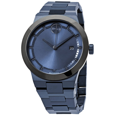 Blue ion-plated stainless steel case with a blue ion-plated stainless steel bracelet. Fixed black ceramic bezel. Blue dial with blue hands and the signature Movado dot appears at the 12 o'clock position hour markers. Minute markers around the outer rim. Dial Type: Analog. Date display at the 3 o'clock position. Quartz movement. Scratch resistant k1 crystal. Pull / push crown. Solid case back. Round case shape. Case size: 42.3 mm. Hidden clasp. Water resistant at 30 meters / 100 feet. Functions: date, hour, minute, second. Casual watch style. Watch label: Japan Movt. Movado BOLD Fusion Quartz Blue Dial Men's Watch 3600661.