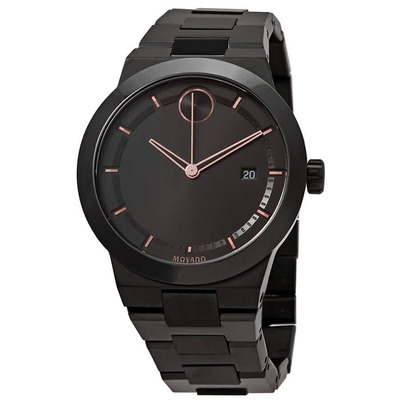 Black ion-plated stainless steel case with a black ion-plated stainless steel bracelet. Fixed black ceramic bezel. Black dial with rose gold-tone hands and index hour markers. Minute markers around the outer rim. Dial Type: Analog. Date display at the 3 o'clock position. Quartz movement. Scratch resistant k1 crystal. Pull / push crown. Solid case back. Round case shape. Case size: 42.3 mm. Hidden clasp. Water resistant at 30 meters / 100 feet. Functions: date, hour, minute, second. Casual watch style. Watch label: Swiss Made. Movado BOLD Fusion Quartz Black Dial Mens Watch 3600662.