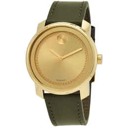 Yellow gold ion-plated stainless steel case with a olive green leather strap. Fixed yellow gold ion-plated stainless steel bezel. Gold dial with yellow gold-tone hands and index hour markers. Minute markers around the outer rim. The Movado dot appears at the 12 o'clock position. Dial Type: Analog. Quartz movement. Scratch resistant sapphire crystal. Pull / push crown. Solid case back. Round case shape. Case size: 42.5 mm. Case thickness: 10 mm. Band width: 20 mm. Tang clasp. Water resistant at 30 meters / 100 feet. Functions: hour, minute. Casual watch style. Watch label: Swiss Made. Movado Bold Metals Quartz Gold Dial Mens Watch 3600674.