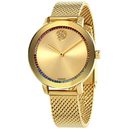 Pale yellow gold ion-plated stainless steel case with a pale yellow gold ion-plated stainless steel mesh bracelet. Fixed pale yellow gold ion-plated bezel. Light gold dial (set with rainbow crystals) with yellow gold-tone hands. No markers. The Movado dot appears at the 12 o'clock position. Dial Type: Analog. Quartz movement. Scratch resistant K1 mineral crystal. Pull / push crown. Solid case back. Round case shape. Case size: 34 mm. Fold over slip through clasp. Water resistant at 30 meters / 100 feet. Functions: hour, minute. Bold Evolution Series. Dress watch style. Watch label: Swiss Made. Movado BOLD Evolution Light Gold Dial Ladies Watch 3600699.