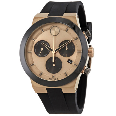 Bronze ion-plated stainless steel case with a black silicone strap. Fixed black ceramic bezel. Bronze dial with black/bronze hands and index hour markers. Minute markers. The Movado dot appears atthe 12 o'clock position. Dial Type: Analog. Date display at the 4 o'clock position. Two black sub-dials displaying: 60 second and 30 minute. day of the week. Quartz movement. Scratch resistant K1 mineral crystal. Pull / push crown. Solid case back. Round case shape. Case size: 44 mm. Case thickness: 11 mm. Band width: 27 mm. Tang clasp. Water resistant at 30 meters / 100 feet. Functions: chronograph, date, hour, minute, second. Bold Fusion Series. Dress watch style. Movado Bold Fusion Chronograph Quartz Bronze Dial Mens Watch 3600711.