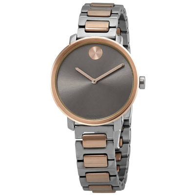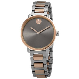 Stainless steel case with a two-tone (silver-tone and pale rose gold PVD) stainless steel bracelet. Fixed rose gold-tone bezel. Grey dial with pale rose gold-tone hands. No markers. The Movado dot appears at the 12 o'clock positions. Dial Type: Analog. Quartz movement. Scratch resistant K1 mineral crystal. Pull / push crown. Solid case back. Round case shape. Case size: 34 mm. Case thickness: 10 mm. Band width: 15 mm. Fold over clasp with a push button release. Water resistant at 30 meters / 100 feet. Functions: hour, minute. Bold Shimmer Series. Casual watch style. Movado BOLD Shimmer Quartz Grey Dial Ladies Watch 3600722.