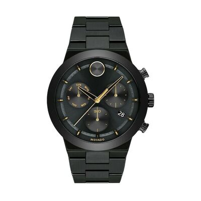 Black-plated stainless steel case and bracelet. Fixed black ceramic bezel. Black dial with gold-tone hands and index hour markers. Minute markers around the outer rim. The Movado Dot appears at the 12 o'clock position. Dial Type: Analog. Date display at the 4 o'clock position. Quartz movement. Scratch resistant sapphire crystal. Solid case back. Round case shape. Case size: 44 mm. Fold over clasp. Water resistant at 50 meters / 165 feet. Functions: chronograph, date, hour, minute, second. Bold Fusion Series. Sport watch style. Movado Bold Fusion Chronograph Quartz Black Dial Mens Watch 3600730.