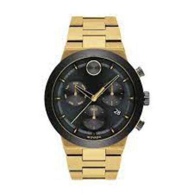 Yellow gold-tone stainless steel case and bracelet. Fixed black ceramic bezel. Black dial with yellow gold-tone hands and index hour markers. Minute markers around the outer rim. The Movado dot appears at the 12 o'clock position. Dial Type: Analog. Date display at the 4 o'clock position. Quartz movement. Scratch resistant K1 mineral crystal. Pull / push crown. Solid case back. Round case shape. Case size: 44 mm. Deployment clasp with a push button release. Water resistant at 30 meters / 100 feet. Functions: chronograph, date, hour, minute, second. Bold Fusion Series. Sport watch style. Watch label: Swiss Made. Movado Bold Fusion Chronograph Quartz Black Dial Mens Watch 3600731.
