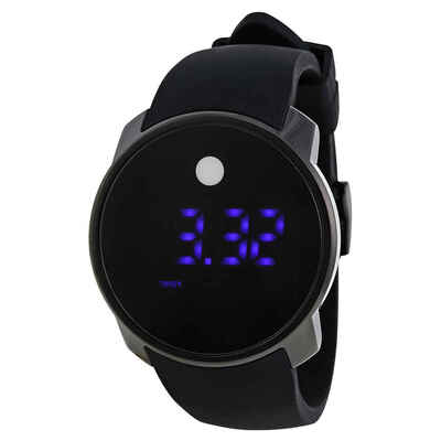 Black ion-plated stainiless steel case with a black silicone strap. Fixed black TR90 composite bezel. Black touch screen dial. The Movado dot marks the 12 o'clock position. Dial Type: digital. Digital date display. Quartz movement. Scratch resistant K1 crystal. Solid case back. Case diameter: 45 mm. Case thickness: 10.5 mm. Round case shape. Band width: 25 mm. Tang clasp. Water resistant at 30 meters / 100 feet. Functions: date, hour, minute, second, dual time display. Sport watch style. Movado Bold Touch Screen Digital Dual Time Black Silicone Mens Watch 3600144.