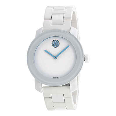 Stainless steel and TR90 composite case with a stainless steel, white silicone and white resin strap. Fixed TR90 composite bezel. White dial. Light blue Movado dot set with stones appears at the 12 o'clock position. Dial Type: Analog. Quartz movement. Scratch resistant mineral crystal. Pull / push crown. Light blue case back. Case diameter: 36 mm. Case thickness: 10 mm. Round case shape. Deployment clasp. Water resistant at 30 meters / 100 feet. Functions: hour, minute. Casual watch style. Watch label: Swiss Made. Movado Bold White Dial White Steel and Resin Bracelet Unisex Watch 3600158.