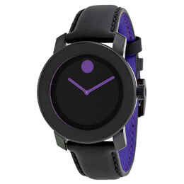 Stainless steel case with a black leather strap with purple lining. Fixed black steel bezel. Black dial with purple hands. No markers. The Movado dot marks the 12 o'clock position. Dial Type: Analog. Quartz movement. Scratch resistant mineral crystal. Pull / push crown. Solid case back. Case diameter: 36 mm. Case thickness: 9.5 mm. Round case shape. Band width: 17.8 mm. Tang clasp. Water resistant at 50 meters / 165 feet. Functions: hour, minute. Casual watch style. Movado Bold Black and Purple Unisex Watch 3600165.