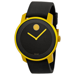 Sandblasted yellow aluminum case with a black silicone strap. Fixed yellow aluminum bezel. Black textured dial with yellow hands. No markers. The Movado dot appears at the 12 o'clock position. Dial Type: Analog. Quartz movement. Scratch resistant K1 crystal. Solid case back. Case diameter: 43.5 mm. Round case shape. Tang clasp. Water resistant at 30 meters / 100 feet. Functions: hour, minute. Casual watch style. Movado Bold Black Dial Yellow Aluminium Unisex Watch 3600167.