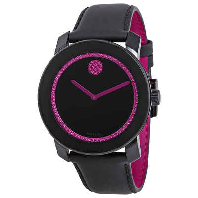 Black TR90 composite material case with a black leather strap with berry lining. Fixed black TR90 composite material bezel. Black dial with pink crystal accents and pink hands. Movado crystal-set dot marks the 12 o'clock position. Dial Type: Analog. Swiss quartz movement. Scratch resistant K1 crystal. Pull / push crown. Solid case back. Case diameter: 42 mm. Round case shape. Tang clasp. Water resistant at 30 meters / 100 feet. Functions: hour, minute. Dress watch style. Movado Bold 42 Special Edition BCRF Pink and Black Leather Ladies Watch 3600179.