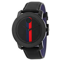 Black TR90 composite and stainless steel case with a black leather strap. Fixed bezel. Black dial with puple and pink stripe with black hands. Movado dot at the 12 o'clock position. Dial Type: Analog. Quartz movement. Scratch resistant K1 crystal. Pull / push crown. Case diameter: 42 mm. Round case shape. Band width: 22 mm. Tang clasp. Water resistant at 30 meters / 100 feet. Functions: hour, minute. Casual watch style. Movado Bold Black Dial Black Leather Strap Unisex Watch 3600224.