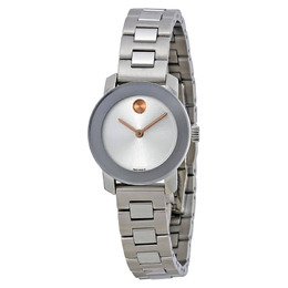 Stainless steel case with a stainless steel bracelet. Fixed stainless steel mirror-finish bezel. Silver dial with silver-tone hands. The Movado dot marks the 12 o'clock position. Dial Type: Analog. Quartz movement. Scratch resistant K1 crystal. Pull / push crown. Solid case back. Case diameter: 25 mm. Case thickness: 7 mm. Round case shape. Deployment with push button release clasp. Water resistant at 30 meters / 100 feet. Functions: hour, minute. Dress watch style. Movado Bold Silver Diakl Stainless Steel Ladies Watch 3600234.