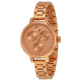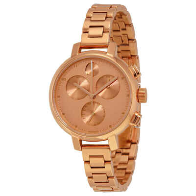 Rose gold IP stainless steel case with a rose gold IP stainless steel bracelet. Fixed bezel. Rose gold-tone dial with gold-toned hands and Arabic hour markers. Minute markers around the outer rim. Dial Type: Analog. Chronograph - three sub-dials displaying: 60 second, 30 minute and date. Quartz movement. Scratch resistant k1 mineral crystal. Case diameter: 34 mm. Round case shape. Deployment clasp. Water resistant at 30 meters / 100 feet. Functions: chronograph, date, hour, minute, second. Dress watch style. Movado Bold Rose Gold IP Stainless Steel Chronograph Ladies Watch 3600240.