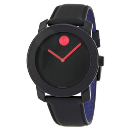 Black TR90 composite case with a black leather strap (with purple lining). Fixed black TR90 composite bezel. Black dial with red hands. The Movado dot marks the 12 o'clock position. Dial Type: Analog. Quartz movement. Scratch resistant K1 crystal. Pull / push crown. Solid case back. Case diameter: 42 mm. Round case shape. Tang clasp. Water resistant at 30 meters / 100 feet. Functions: hour, minute. Casual watch style. Movado Bold Black Dial Black Leather Mens Watch 3600246.