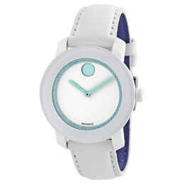 White TR90 composite and stainless steel case with a white leather strap. Fixed bezel. White Museum dial with Swarovski element crystal ring and blue hands. Movado dot at the 12 o'clock position. Dial Type: Analog. Quartz movement. Scratch resistant K1 crystal. Pull / push crown. Case diameter: 36mm. Round case shape. Tang clasp. Water resistant at 30 meters / 100 feet. Functions: hour, minute. Casual watch style. Movado Bold White Dial Swarovski Crystal White Leather Ladies Watch 3600251.