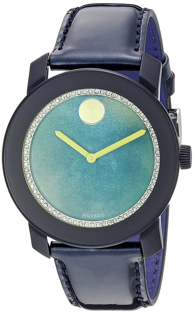 Black tr90 composite and stainless steel case with a blue patent leather strap. Fixed bezel. Multi-tonal green watercolor dial. Crystal pave around the outer rim. Dial Type: Analog. Quartz movement. Scratch resistant k1 mineral crystal. Case diameter: 42 mm. Round case shape. Tang clasp. Water resistant at 30 meters / 100 feet. Functions: hour, minute. Dress watch style. Movado Bold Green Watercolor Dial Ladies Watch 3600267.