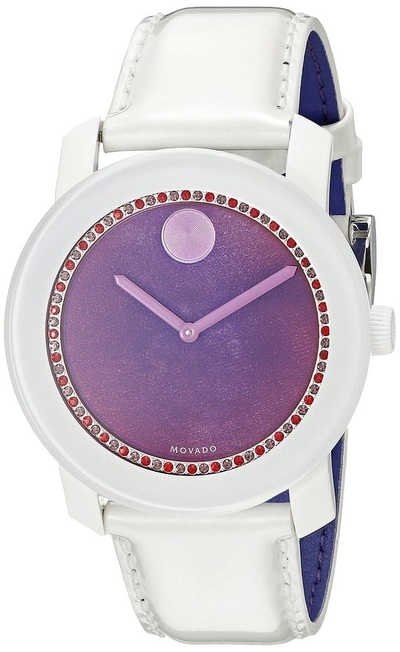 White tr90 composite and stainless steel case with a white patent leather strap. Fixed bezel. Multi-tonal red dial. Multi-color crystal pave around the outer rim. Dial Type: Analog. Quartz movement. Scratch resistant k1 mineral crystal. Case diameter: 42 mm. Round case shape. Tang clasp. Water resistant at 30 meters / 100 feet. Functions: hour, minute. Dress watch style. Movado Bold Red Watercolor Dial Ladies Watch 3600269.