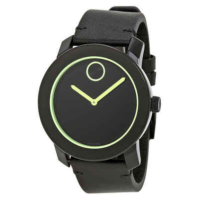 Black stainless steel case with a black leather strap. Fixed black stainless steel bezel. Black dial with green hands. No markers. The Movado dot appears at the 12 o'clock position. Dial Type: Analog. Luminescent hands and markers. Quartz movement. Scratch resistant sapphire crystal. Pull / push crown. Solid case back. Case diameter: 42 mm. Round case shape. Tang clasp. Water resistant at 30 meters / 100 feet. Functions: hour, minute. Dress watch style. Movado Bold Black Dial Green Hands Black Leather Strap Mens Quartz Watch 3600273.