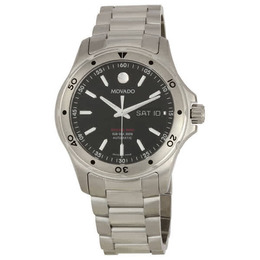 Silver-tone stainless steel case with a silver-tone stainless steel bracelet. Fixed silver-tone stainless steel bezel. Black dial with luminous hands and stick hour markers. Minute markers around the outer rim. the signature movado dot appears at the 12 o'clock position. Dial Type: Analog. Luminescent hands and markers. Date and day of the week display at the 3 o'clock position. Automatic movement. Scratch resistant sapphire crystal. Screw down crown. Solid case back. Round case shape, case size: 40 mm, case thickness: 12 mm. Deployment clasp. Water resistant at 200 meters / 660 feet. Functions: date, day, hour, minute. Sport watch style. Watch label: Swiss Made. Movado Series 800 Automatic Black Dial Mens Watch 2600081.