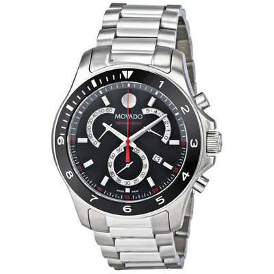 Stainless steel case with a stainless steel bracelet. Fixed stainless steel bezel. Black dial with silver-tone hands and index hour markers. Minute markers around the outer rim. Dial Type: Analog. Luminescent hands and markers. Date display at the 4 o'clock position. Chronograph - three sub-dials displaying: 60 second, 1/10th of a second and 12 hour. Quartz movement. Scratch resistant sapphire crystal. Pull / push crown. Solid case back. Case diameter: 42 mm. Case thickness: 12.2 mm. Band width: 22 mm. Deployment clasp with push button release. Water resistant at 200 meters / 660 feet. Functions: chronograph, date, hour, minute, second. Sport watch style. Watch label: Swiss Made. Movado 800 Performance Black Dial Chronograph Stainless Steel Mens Watch 2600090.